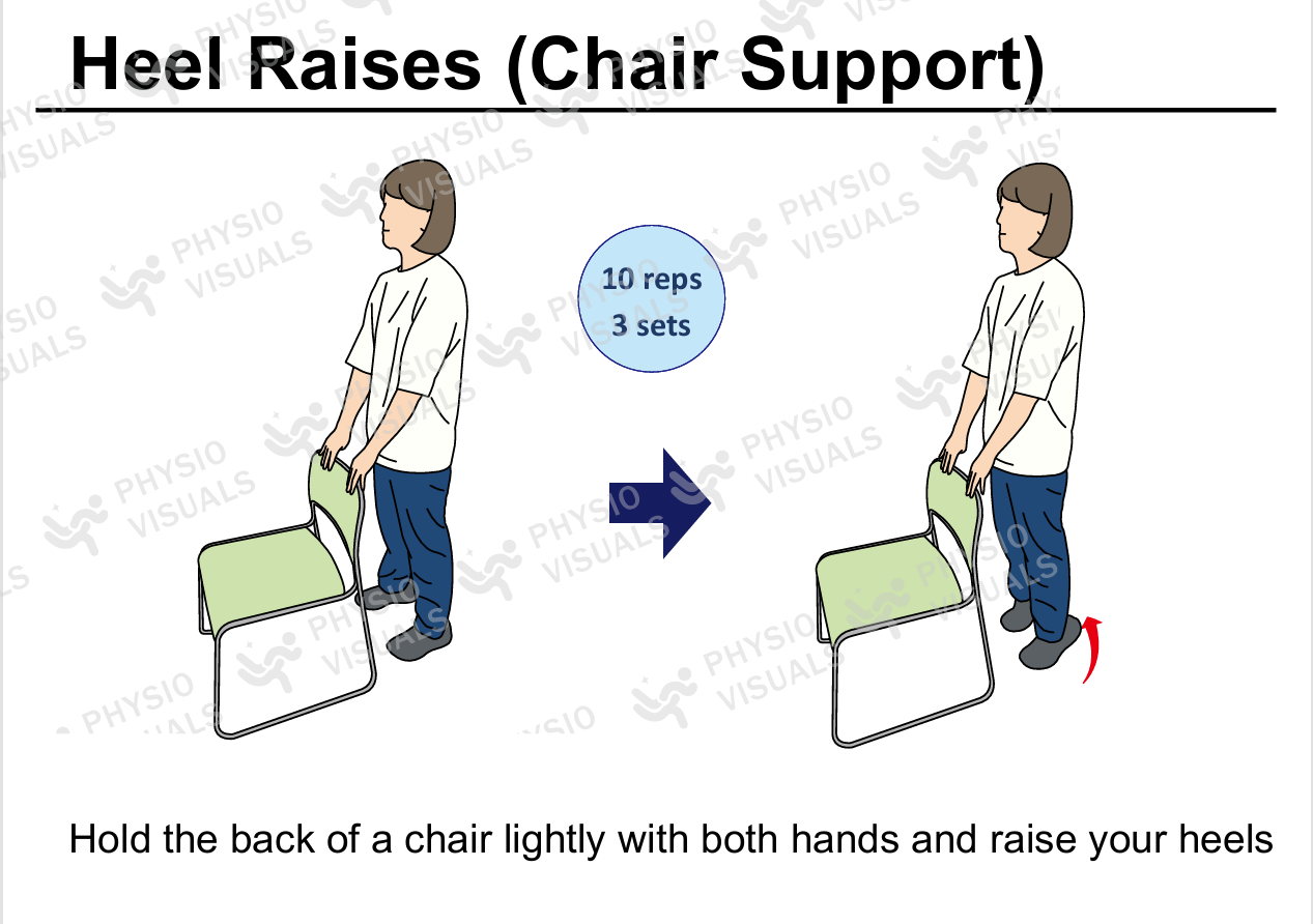 This exercise strengthens the calf muscles and improves balance and walking ability.
