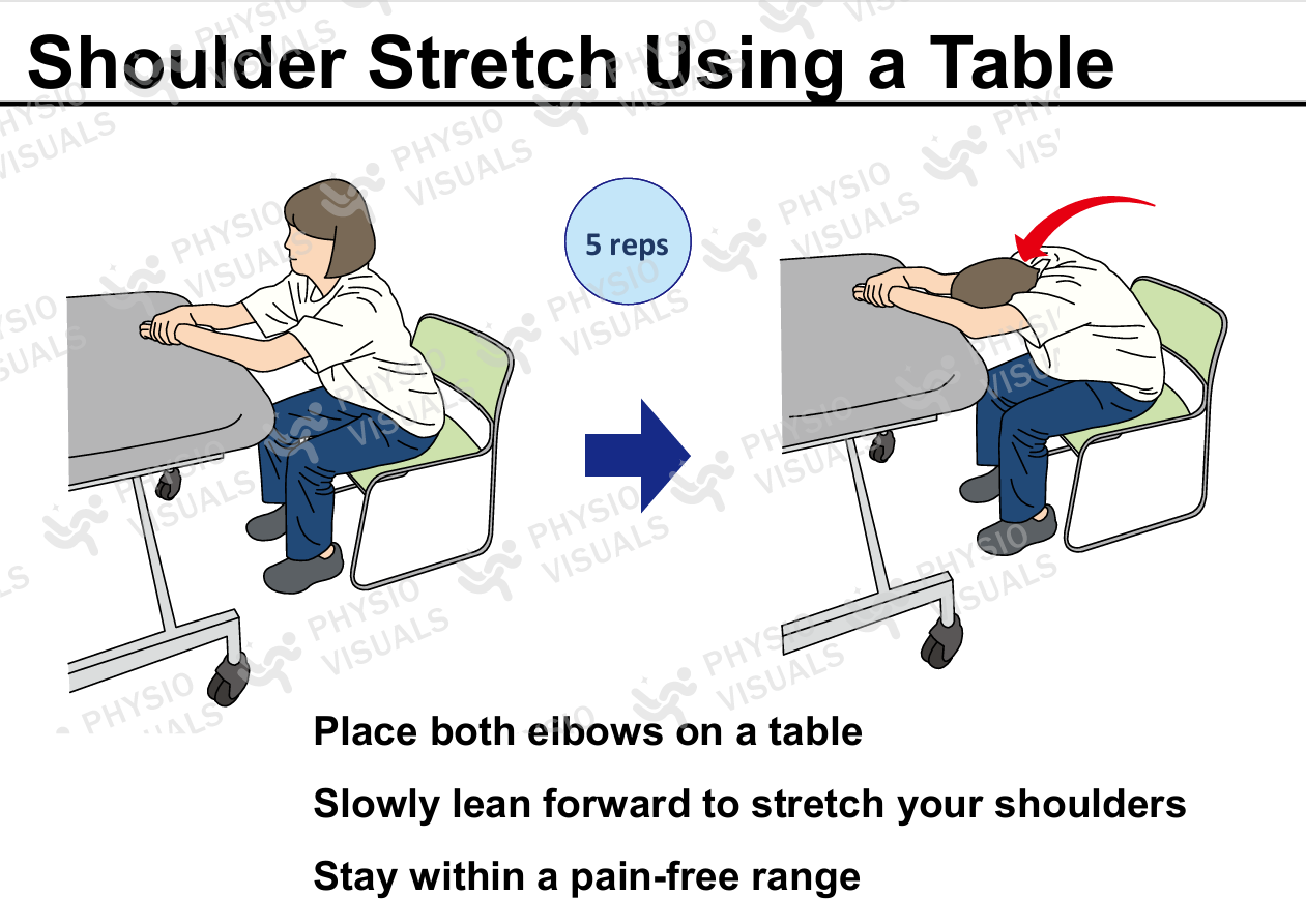 Also known as a table-supported shoulder stretch or forward lean shoulder stretch.